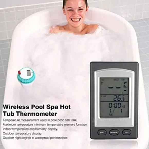 4. Trådlös regnrock: SPA-termometern har inga kabelbegränsningar och kan placeras var som helst. Termometern är vattentät och kan flyta i vatten för att kontrollera temperaturen i din pool.