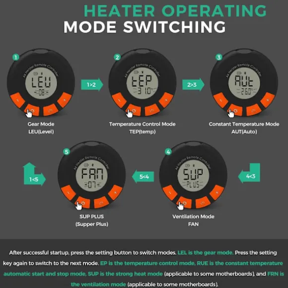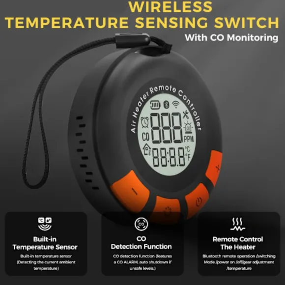 – Detektering av kolmonoxidkoncentration (CO): Den kan visa och detektera den aktuella kolmonoxidkoncentrationen (CO) i omgivningen. Ett larm ljuder när koncentrationen överstiger standardvärdet. När koncentrationen överskrids kraftigt stänger värmebrytaren automatiskt av värmaren.