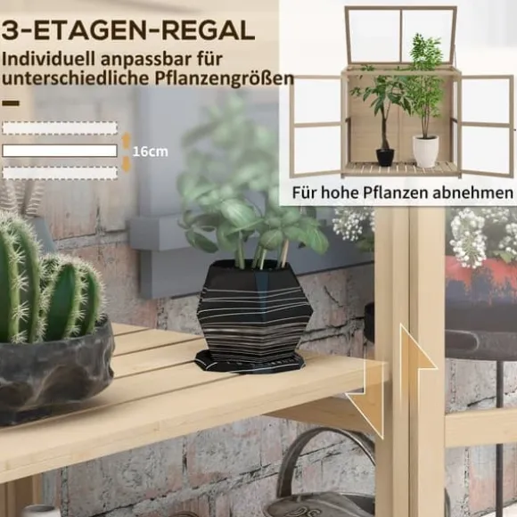 – Tvåskiktad planteringsyta: Den tvåskiktade planteringsytan med justerbar mittdel erbjuder tre höjdinställningar (med 16 cm mellanrum) för olika växtstorlekar.