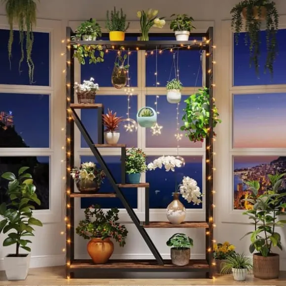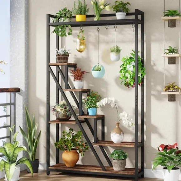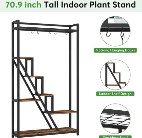180 cm högt växtställ – Detta inomhusblomställ har en elegant design och erbjuder 7 breda och rymliga hyllor. Det rymmer över 10 krukor i normal storlek, medan den översta trådhyllan är perfekt för att visa upp små bonsaiplantor. Det inkluderar också 5 S-krokar för att hänga växter.