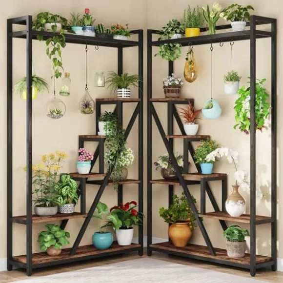 7-vånings stegedesign – Utnyttja dina vertikala och hörnutrymmen effektivt med detta unika 7-vånings stegformade hängande växtställ. Dess smarta design maximerar utrymmet, och hyllornas varierande höjder är lämpliga för olika typer av växter. De öppna hyllorna gör att växterna kan få rikligt med solljus utan hinder.
