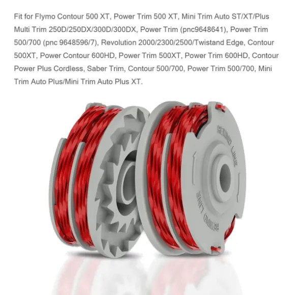 Ersättningsspole med trimmertråd som passar för följande grästrimmer: Flymo Contour 500 XT, Power Trim 500 XT, Mini Trim Auto ST/XT/Plus Multi Trim 250D/250DX/300D/300DX, Power Trim (pnc9648641), Power Trim 500/700 (pnc 2/0705 Revolution 96085), /2300/2500/Twistand Edge, Contour 500XT, Power Contour 600HD, Power Trim 500XT, Power Trim 600HD, Contour Power Plus Cordless, Sabre Trim, Contour 500/700, Power Trim 500/700, Mini Trim Auto Plus/Mini Trim Plus XT.