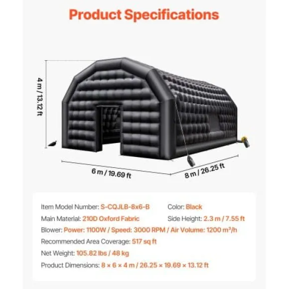 Skapa en minnesvärd evenemangsplats med denna uppblåsbara nattklubb, perfekt för fester, bröllop och familjesammankomster. Den rymliga interiören, snabba uppsättningen och användarvänliga funktioner gör den idealisk för utomhusfester, medan slitstarka material säkerställer pålitlig användning i olika väderförhållanden.