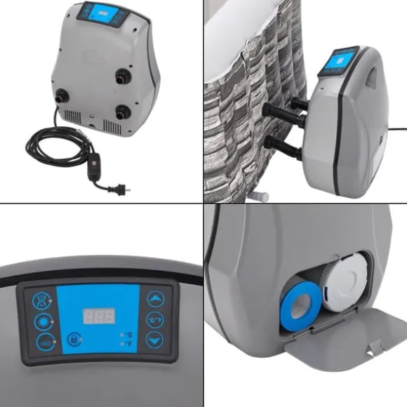 Poolen är utrustad med ett inbyggt vattenfiltersystem och en praktisk filterpatron. Överdraget håller inte bara vattnet varmt, utan skyddar också poolen från smuts och föroreningar.