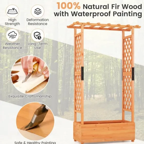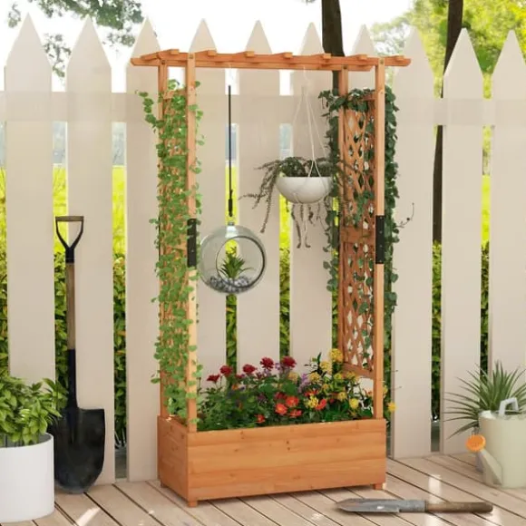 Höjdbädd med bågspaljé i orange är ett stabilt och stilfullt tillskott till vilken trädgård som helst. Tillverkad av naturligt fura trä, den har en planteringslåda, spaljé och hängande tak, vilket gör den idealisk för att odla olika växter, inklusive klätterväxter och vinstockar.
