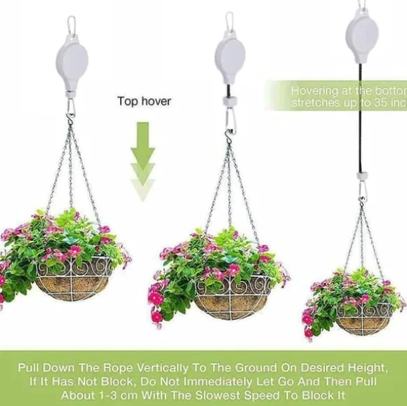 Hållarna är utrustade med ett smart repsystem som låser sig automatiskt när du släpper repet. Genom att bara dra i repet kan du enkelt justera höjden på dina växter upp till 1,6 meter, vilket gör vattning och omplacering mycket enklare.