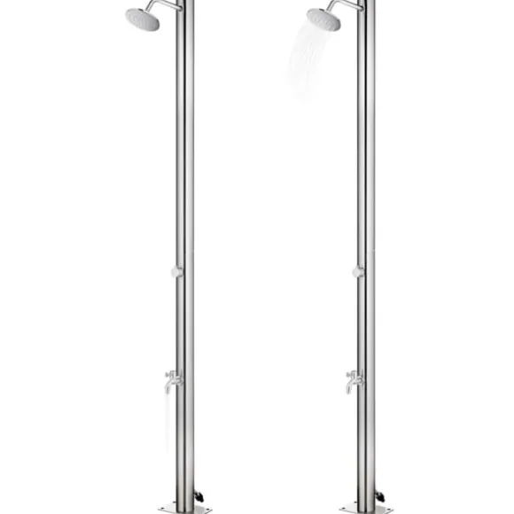 Denna utedusch är tillverkad i rostfritt stål vilket gör den väderbeständig. Duschsystemet har en huvuddusch och en fotkran för att möta dina olika behov.