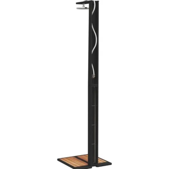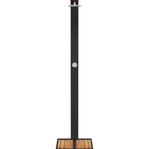 - Lamellbotten i trä: Tack vare basen i akaciaträ är uteduschen stabil en säker plats att stå under duschen. Dessutom förhindrar lamellbasen vatten från att samlas och håller dina fötter borta från skräp.
