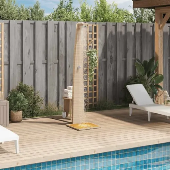 - Snygg och trendig: Med sin tidlösa design utstrålar poolduschen en rustik charm och blir ett iögonfallande tillskott till din trädgård eller bakgård.