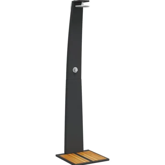 - Lamellbotten i trä: Tack vare basen i akaciaträ är uteduschen stabil en säker plats att stå under duschen. Dessutom förhindrar lamellbasen vatten från att samlas och håller dina fötter borta från skräp.