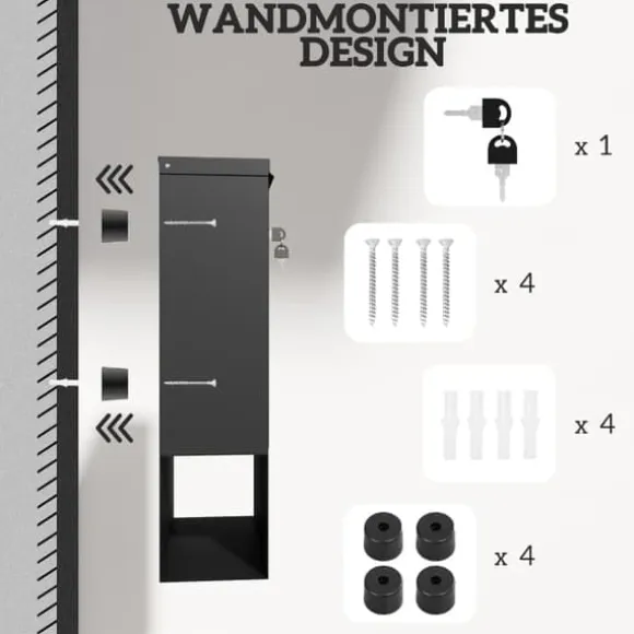 – Enkel installation: Utrustad med alla nödvändiga skruvar, bultar och gummikilar kan brevlådan snabbt och enkelt monteras nära din grind eller dörr.