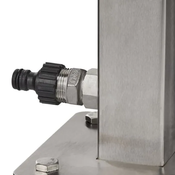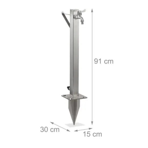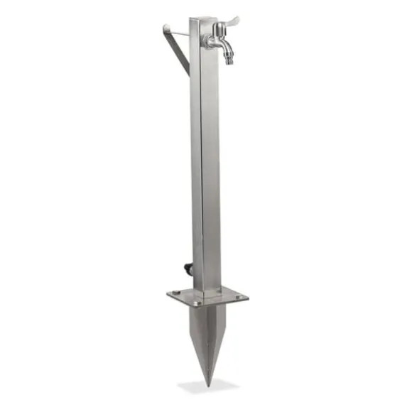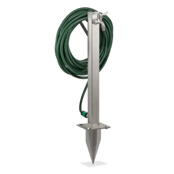 Denna praktiska vattenpelare med integrerad slanghållare är en bekväm lösning för att hålla din trädgårdsslang organiserad och lättillgänglig, samtidigt som den erbjuder en utomhusvattenkran för att fylla vattenkannor eller tvätta händerna. Tillverkad av robust, rostfritt stål som inte rostar, kan den enkelt installeras i din trädgård med den medföljande markspetsen eller fästas på stenplattor med markankare. Designen säkerställer att din slang förblir fri från veck och alltid redo att användas.