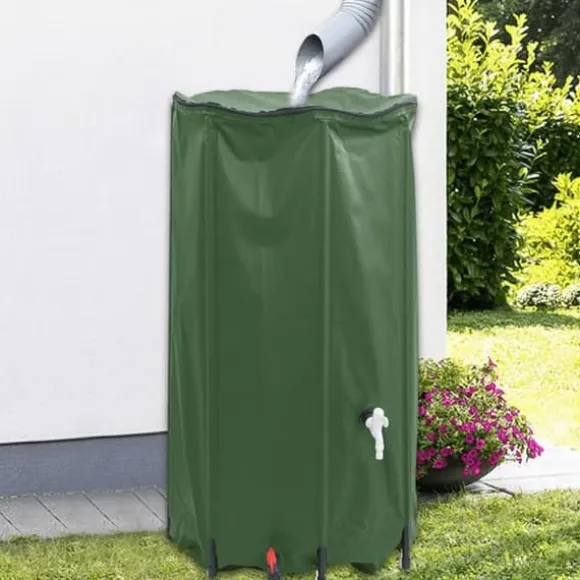 Den hopfällbara regntunnan samlar vatten från regnskurar och sparar vattnet i tanken för senare användning.