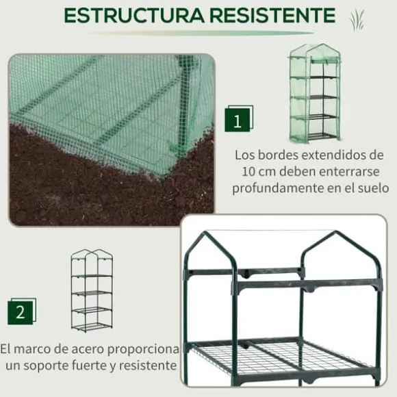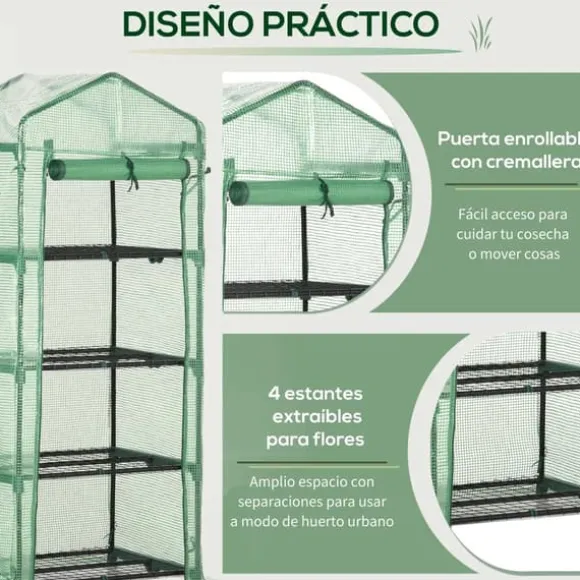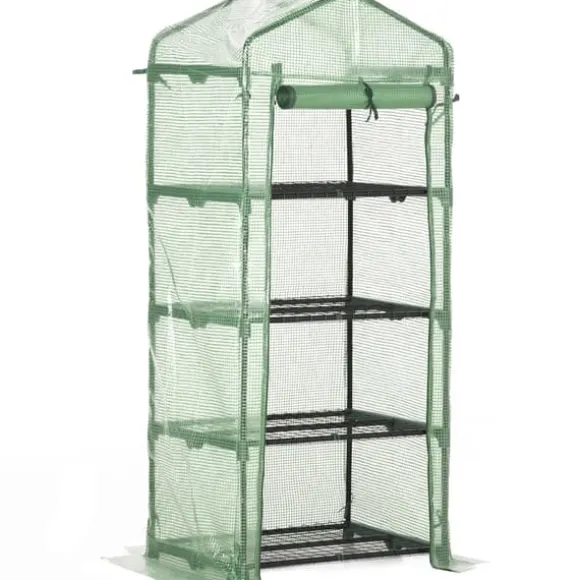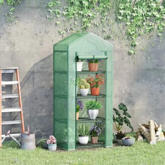Kompakt växthus med 4 hyllplan för balkong, uteplats och trädgårdDetta smidiga växthus skyddar dina växter mot väder och vind och rymmer mycket tack vare fyra stabila hyllplan. Den transparenta PE-duken släpper in solens ljus, medan dragkedjedörren ger snabb och enkel åtkomst.