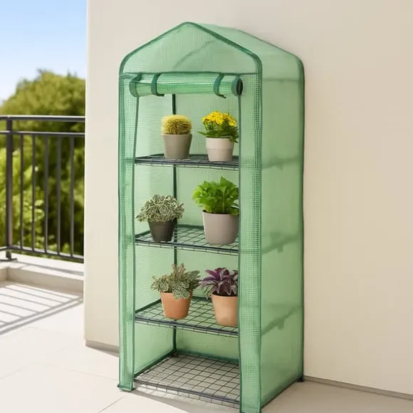 Ge dina växter och plantor den bästa starten på livet med detta praktiska miniväxthus, oavsett årstid. Detta miniväxthus mäter 59 x 39 x 160 cm och är perfekt för små utrymmen med gott om plats och gott om hyllor för att organisera dina växter. Det slitstarka, vattentäta plastskyddet skyddar dina växter från väder som regn, frost, hårda vindar och UV-strålar. Växthuset kan användas inomhus och utomhus och rymmer en mängd olika växtstorlekar.