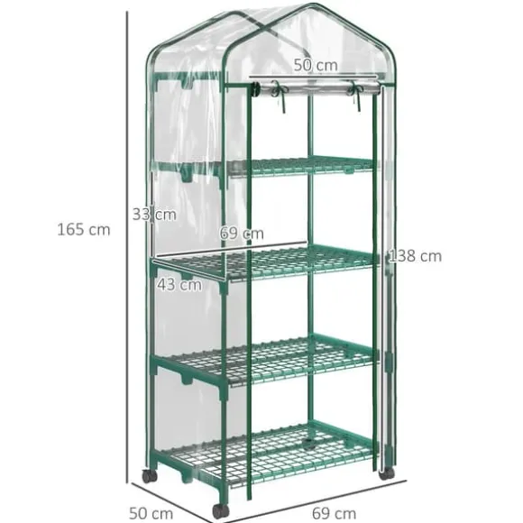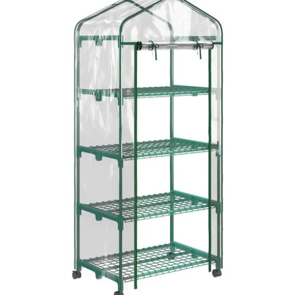 Kompakt, rullbart växthus med 4 hyllplan – stabilt och ljusgenomsläppligtDetta portabla växthus skyddar dina växter och rymmer mycket på liten yta. Den transparenta PVC-duken släpper in gott om solljus, medan den robusta metallramen ger trygg stabilitet. Med smidiga hjul flyttar du växthuset enkelt till den bästa platsen på uteplatsen, balkongen eller i trädgården.