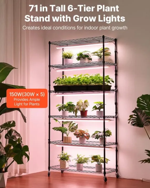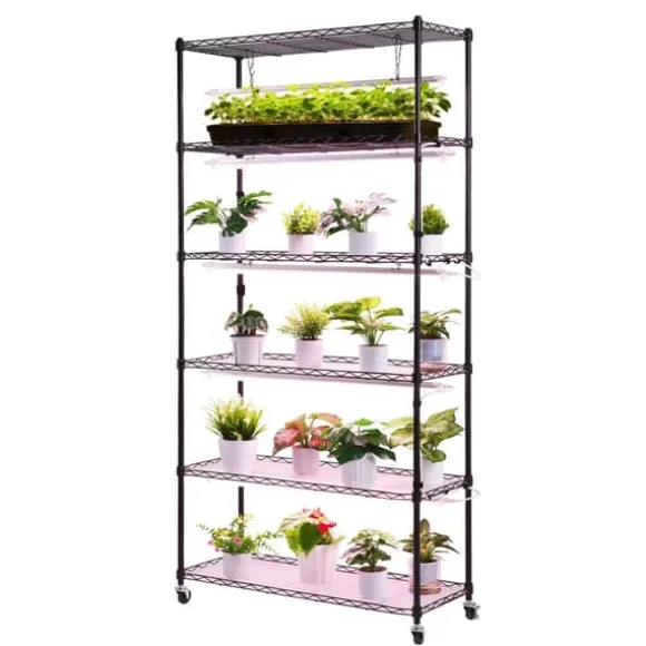 Allt-i-ett växtställ med odlingsljus för inomhusbruk Denna sexvånings växthylla ger en komplett, platsbesparande lösning för odling och visning av krukväxter året runt. Med fullspektrums LED-lampor, inbyggd timer och robust konstruktion får dina växter stabilt ljus, jämn tillväxt och en säker miljö – utan behov av solljus utomhus.