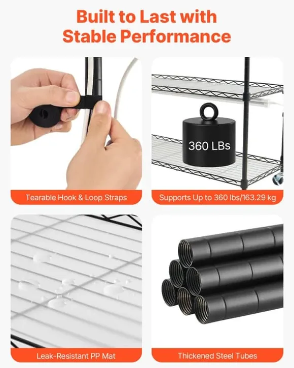 Flexibel och lätt att flytta Hyllplanen kan justeras för olika växthöjder, och fyra kraftiga svänghjul gör det enkelt att rulla stället mellan rum eller till bättre ljus/värme vid behov.