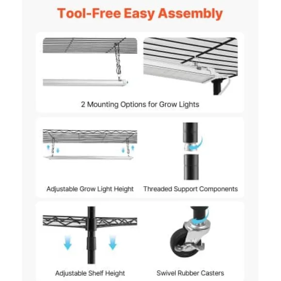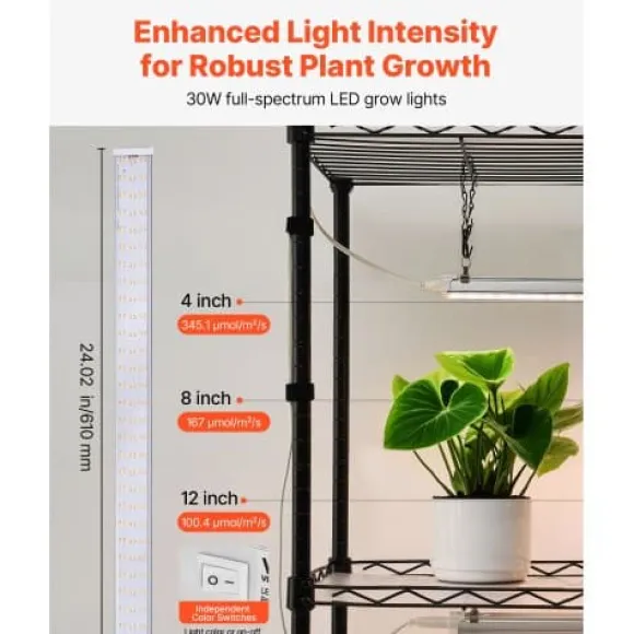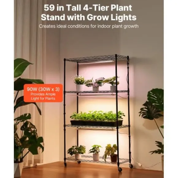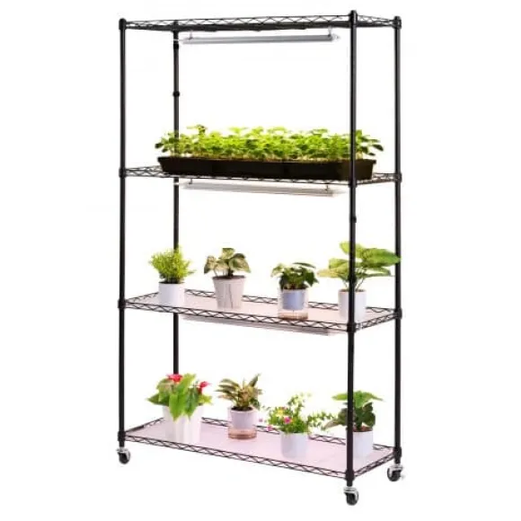 Detta 4-vånings växtställ för inomhusbruk med integrerade fullspektrum växtlampor är perfekt för att odla en mängd olika växter, från plantor till fullvuxna blommor, året runt. För din bekvämlighet har det justerbara hyllor, individuella ljuskontroller och lättrullande hjul för enkel förflyttning. Den robusta metallkonstruktionen ger pålitligt stöd och långvarig hållbarhet för din inomhusträdgård.