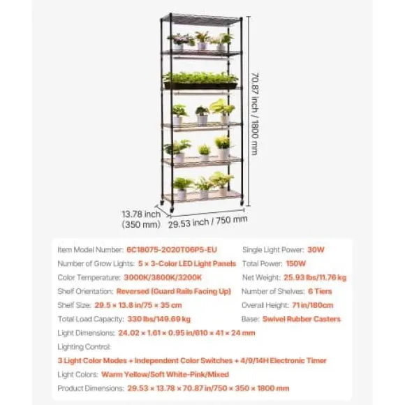 - Antal växtlampor: 5 x 3-färgs LED-ljuspaneler