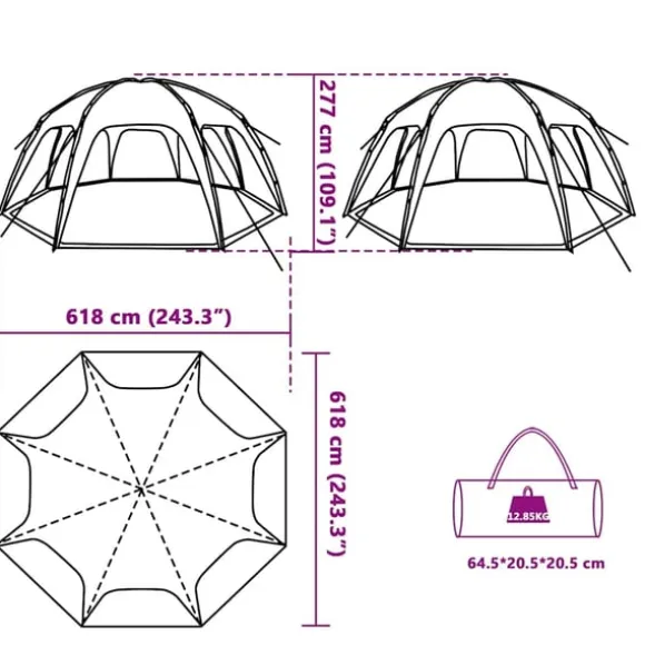 - Tältets mått: 618 x 618 x 277 cm (L x B x H)