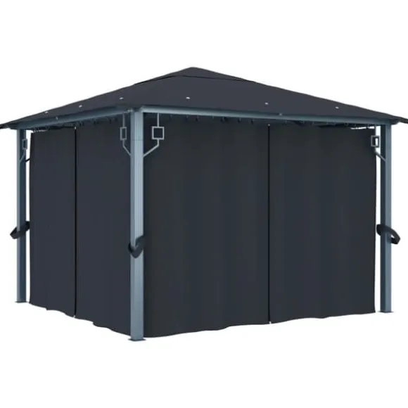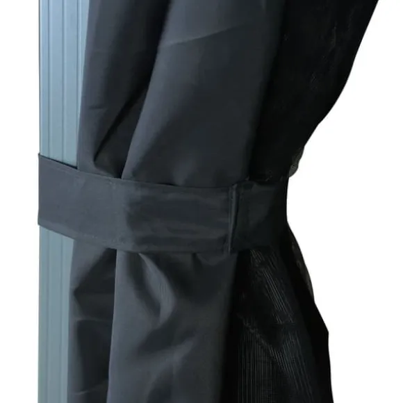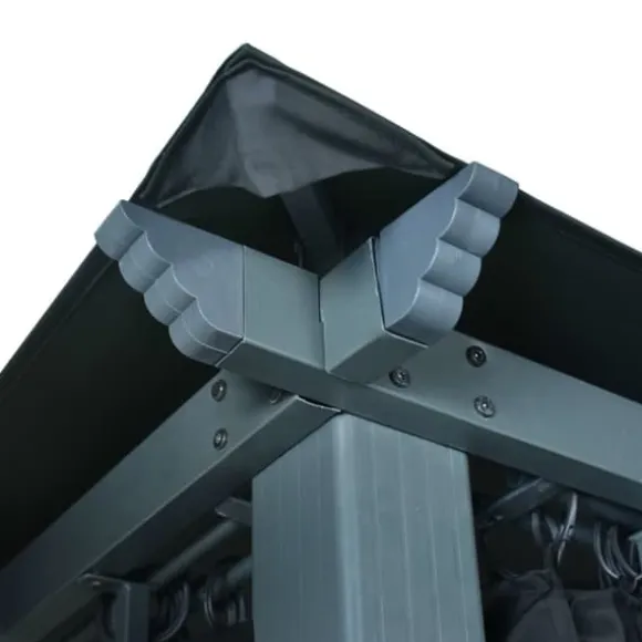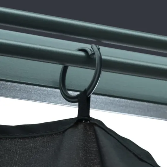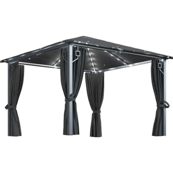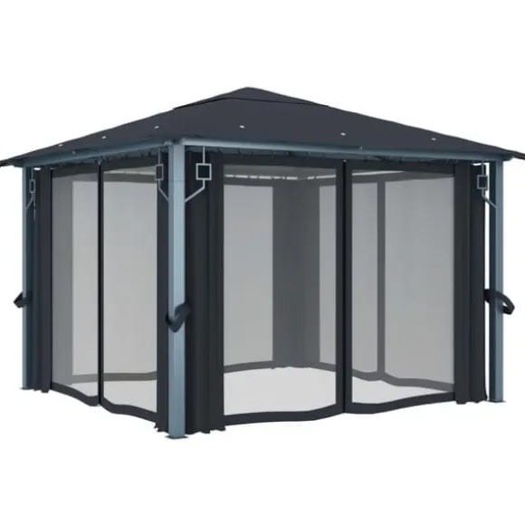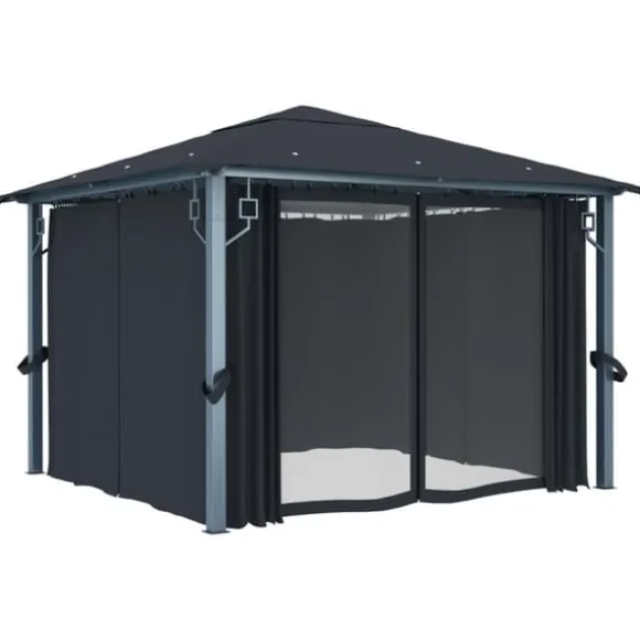 Taket, tillverkat i oxfordtyg med PA-beläggning, skyddar dig mot skadliga UV-strålar i direkt solljus. Paviljongen är massivt tillverkad av stark aluminium och starkt stål och är därför resistent mot rost och mycket stabil. Paviljongen levereras med 4 sidoväggar som kan användas vid dåligt väder. Nätskärmar ingår också för att hålla insekter borta men samtidigt låta luften cirkulera. Kardborrefästen ingår också för enkel fastsättning av draperierna. Dessutom skapar ljusslingan en mysig atmosfär i din trädgård när solen går ner. Ljusslingan förorenar inte miljön eftersom den laddas av solenergi under dagen.