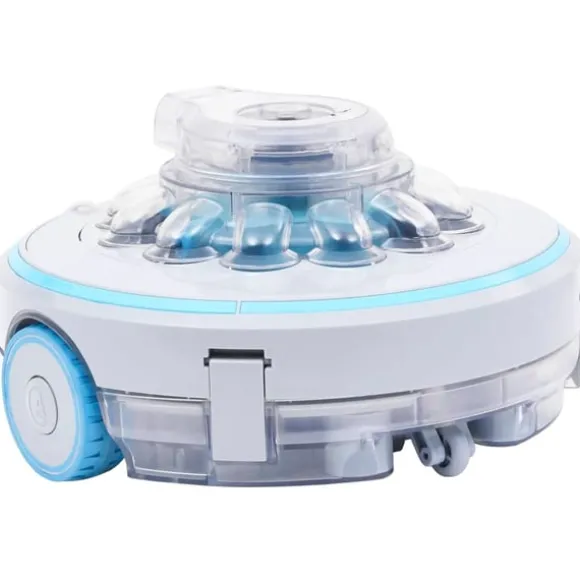Den kan skura, dammsuga och filtrera din pool utan hjälp. De mjuka hjulen gör att roboten enkelt kan förflytta sig i poolen. De kraftfulla skurborstarna kan ta sig an grov smuts och skräp, vilket lämnar poolens golv och väggar rena. Den sladdlösa designen innebär att du inte behöver ha ett strömuttag eller störiga sladdar nära vattnet. Eftersom den saknar sladd behöver du inte oroa dig för trassel eller skada på sladden. Denna intelligenta robot rengör poolen på egen hand utan hjälp och vänder automatiskt när den nuddar väggen. Observera att roboten inte kan klättra på väggar eller trappor.