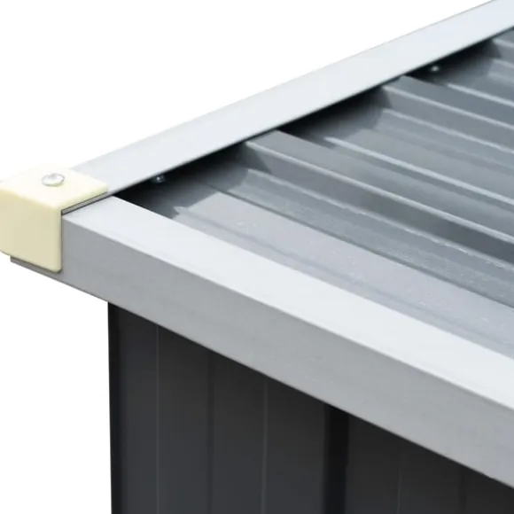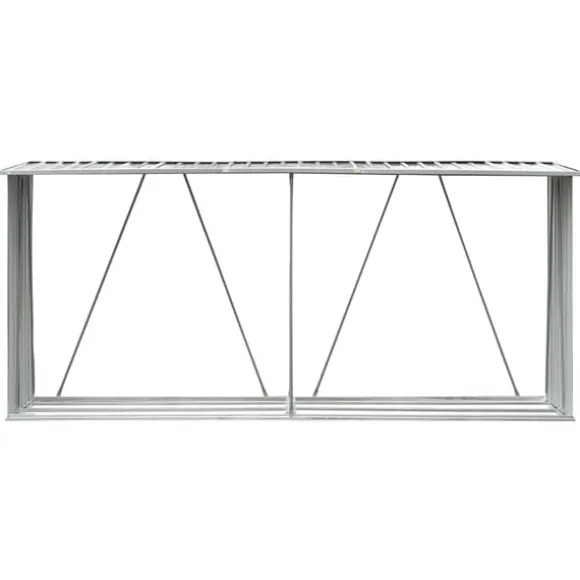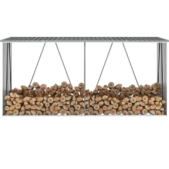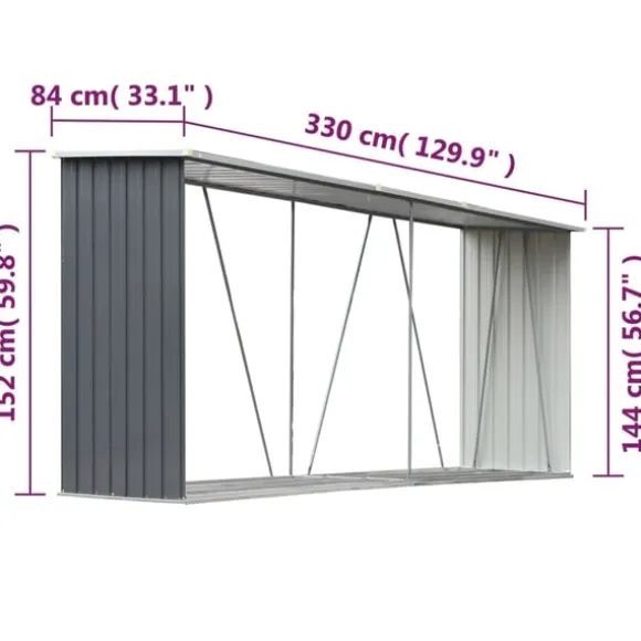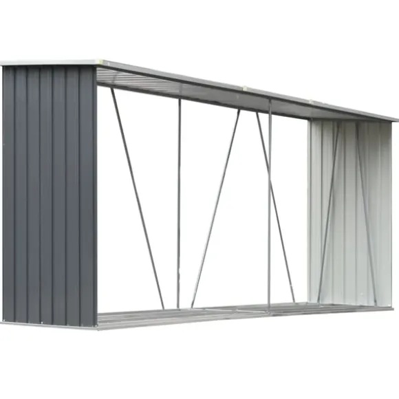 Det har en stabil konstruktion med stödstänger i stål och extra rör på båda sidorna. Eftersom det är tillverkat i galvaniserat stål kräver vedskjulet minimalt underhåll och är mycket hållbart. Denna vedbod har en golvram i stål för ökad stabilitet och upphöjda golvspjälor som håller den ventilerad och torr. Regnvatten rinner automatiskt av från taket tack vare dess lutande design. Vårt vedskjul är enkelt att montera.