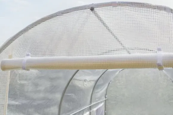 Detta växthus har en robust ram tillverkad av galvaniserade 24 mm profiler och ett slitstarkt PE-film som är resistent mot UV-strålning. Med 6 fönster utrustade med myggnätsfäste och robusta blixtlås hålls skadedjur borta och du kan njuta av ett optimalt klimat för dina växter. De extra flikarna i botten skyddar mot vinden och säkerställer att ditt växthus alltid står stabilt.