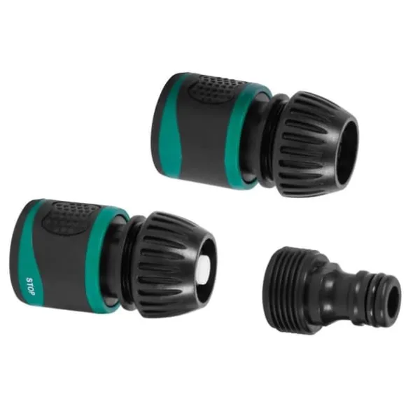 Setet innehåller två slangkopplingar, varav en utan vattenstopp och den andra med vattenstopp. Vattenstoppet säkerställer att vattnet slutar rinna när du byter eller tar bort munstycket (ingår inte). Tack vare snabbkopplingssystemet kan den monteras med ett klick på munstycket eller krananslutningen. Slangkopplingarna kan också anslutas till alla andra märken av snabbkopplingssystem.
