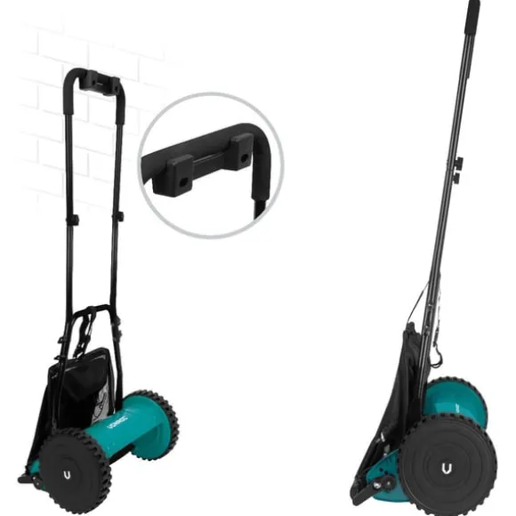 Vi tar hand om våra maskiner på samma sätt som du tar hand om din trädgård. Vi har därför utrustat det övre handtaget med Soft Grip för extra komfort. För kompakt förvaring kan du justera handtaget. Om du föredrar väggmontering är det inga problem… ett väggfäste ingår! Som slutkläm kommer gräsklipparen med en 14L gräsfångare som samlar upp det mesta av det avklippta gräset direkt.
