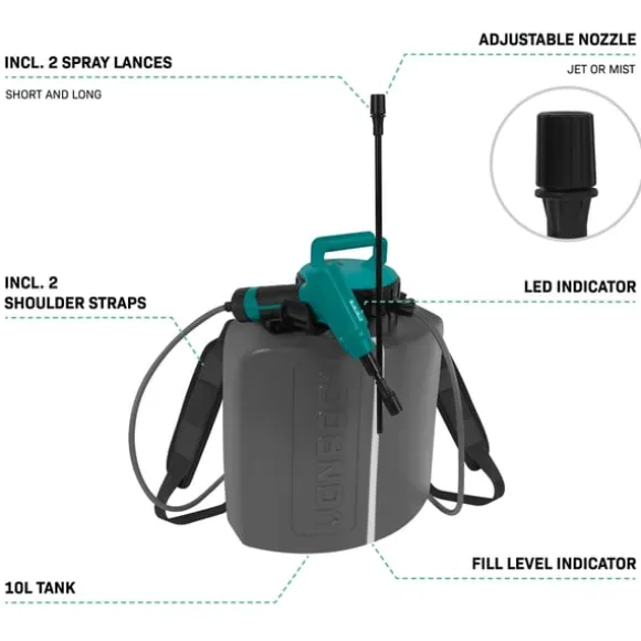 Behållaren rymmer hela 10 liter och är utrustad med en praktisk nivåindikator. Tack vare de breda bärremmarna kan du bekvämt bära sprutan på ryggen som en ryggsäck, medan den 1,5 meter långa slangen ger dig stor rörelsefrihet. Både en kort och en lång sprutlans ingår, så du alltid har rätt tillbehör till hands. Varje lans har ett justerbart munstycke, vilket gör att du enkelt kan växla mellan en kraftig stråle eller en fin dimma. Detta gör trycksprutan mångsidig och användbar för en rad olika uppgifter. Efter användning laddar du enkelt upp batteriet igen med den medföljande USB-C-kabeln.